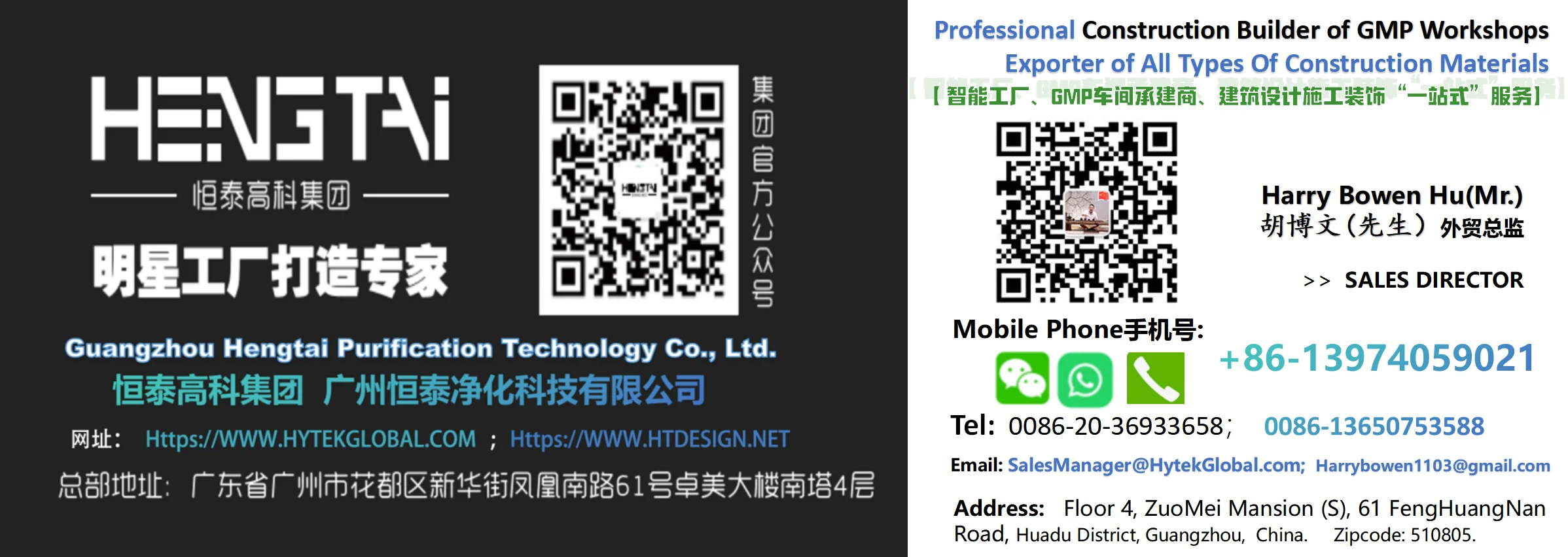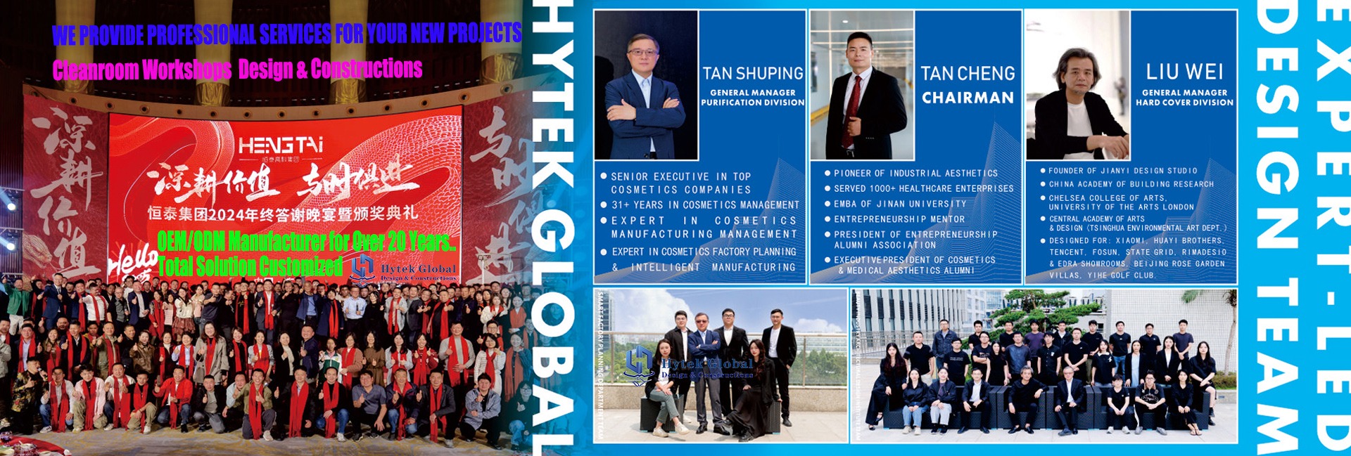 Guangzhou Hengtai Hi-Tech Group Enterprises (Take it Hytek Global) is A leader in the planning and design industry of intelligent factories in China. As a comprehensive service provider in the great health industry Since Early in 2012, Hytek Global has been expertised as an "Overall Intelligent Manufacturing Solution Provider” focusing on the fields of Cosmetics, Medicine and Food, and provides full-cycle services from Industrial Park Planning to Smart Factory Operation and Maintenance.  Hytek Global is integrated with its five major professional companies, such as Guangzhou Hengtai Purification Technology,  Meiye Architectural Design Institute, Guangdong Hengtai Design Engineering Co., Ltd., Guangdong Guochuang Energy Saving Technology Co, Ltd. and Guangzhou Hengtai Hytek Group Co., Ltd. relying on high-quality teams of Tsinghua University Academy of Fine Arts, Guangdong Academy of Fine Arts and other colleges and universities around China to build a complete industry system covering Whole Industrial Plant Planning, GMP Purification Workshops Design and Construction, Commercial Buildings Optimization and Decorations, Intelligent Factory Design and Construction, Modern Warehouse Design and Construction, Innovative Marketing Factory Elements (Such as VIP Visiting Corridors, Product Showrooms and Laboratories Design and Constructions) to achieve the deep integration of Aesthetic Value and Production Efficiency for our customers.